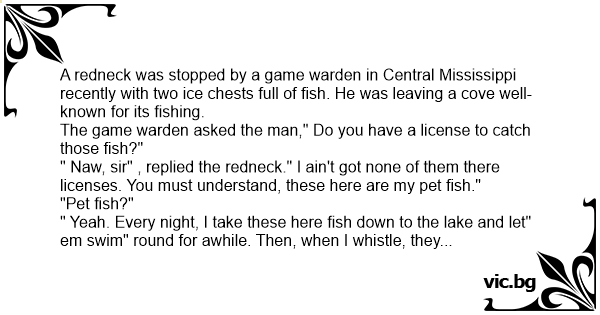 " Naw, sir" , replied the redneck." I ain't got none of them there licenses. You must understand, these here are my pet fish."