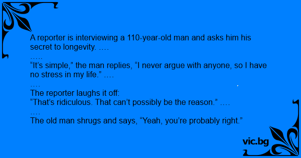 A reporter is interviewing a 110-year-old man and asks him his secret to longevity. ….