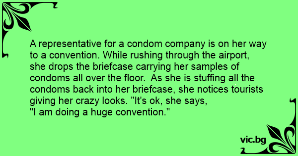 A representative for a соndом company is on her way to a convention. While rushing through the airport, she drops the briefcase carrying her samples of condoms all over the floor. As she is stuffing all the condoms back into her briefcase, she notices tourists giving her crazy looks. "It's ok, she says,