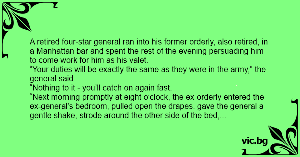 “Next morning promptly at eight o’clock, the ex-orderly entered the ex-general’s bedroom, pulled open the drapes, gave the general a gentle shake, strode around the other side of the bed, spanked his employer’s wife on her bottom and said,