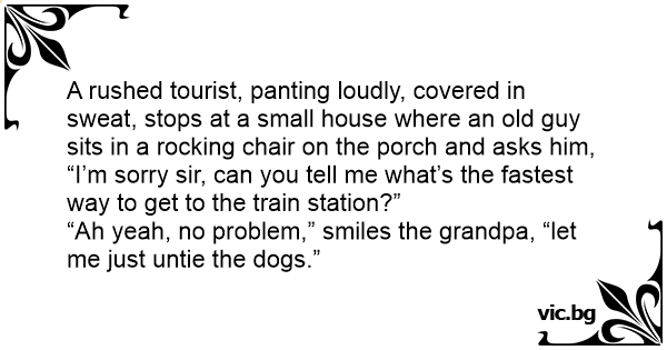 A rushed tourist, panting loudly, covered in sweat, stops at a small house where an old guy sits in a rocking chair on the porch and asks him, “I’m sorry sir, can you tell me what’s the fastest way to get to the train station?”