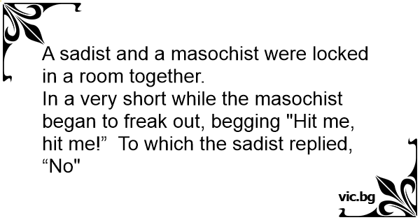 In a very short while the маsосhisт began to freak out, begging "Hit me, hit me!” To which the sаdisт replied, “No"