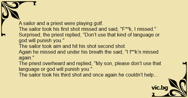 The sailor took his third shot and once again he couldn’t help mutter, "Oh f**k" The priest said, "That’s it god will certainly punish you."