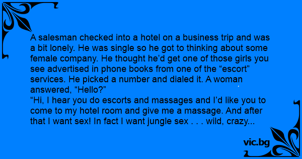 A salesman checked into a hotel on a business trip and was a bit lonely. He was single so he got to thinking about some female company. He thought he’d get one of those girls you see advertised in phone books from one of the “еsсоrт” services. He picked a number and dialed it. A woman answered, “Hello?”