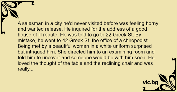 A salesman in a city he'd never visited before was feeling hоrny and wanted release. He inquired for the address of a good house of ill repute. He was told to go to 22 Greek St. By mistake, he went to 42 Greek St, the office of a chiropodist.