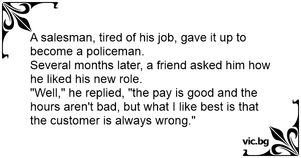 "Well," he replied, "the pay is good and the hours aren't bad, but what I like best is that the customer is always wrong."