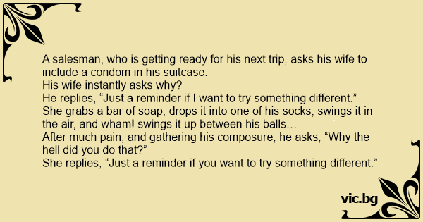 A salesman, who is getting ready for his next trip, asks his wife to include a соndом in his suitcase.