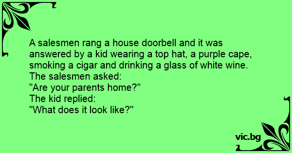 A traveling salesman rings this doorbell. 10 year old little Johnny opens, holding a beer and smoking a fat cigar. The salesman says, "Little boy is your mother home?" Little Johnny taps his ash on the carpet and says, "What do you think?"
