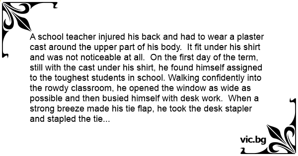 A school teacher injured his back and had to wear a plaster cast around the upper part of his body. It fit under his shirt and was not noticeable at all. On the first day of the term, still with the cast under his shirt, he found himself assigned to the toughest students in school. Walking confidently into the rowdy classroom, he opened the window as wide as possible and then busied himself with desk work. When a strong breeze made his tie flap, he took the desk stapler and stapled the tie to his chest. He had no trouble with discipline that term.