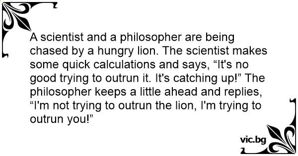 A scientist and a philosopher are being chased by a hungry lion. The scientist makes some quick calculations and says, “It's no good trying to outrun it. It's catching up!” The philosopher keeps a little ahead and replies, “I'm not trying to outrun the lion, I'm trying to outrun you!”