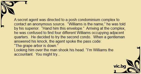 Looking him over the man shook his head. “I’m Williams the accountant. You might try Williams the spy. Two doors down.”