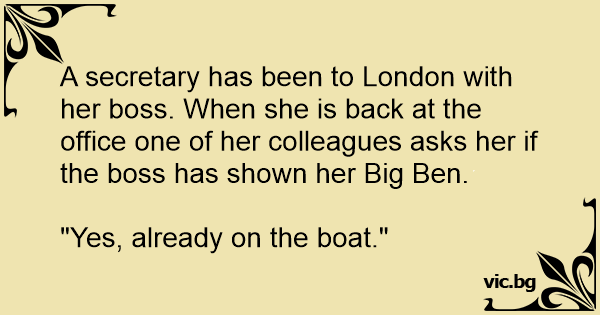 A secretary has been to London with her boss. When she is back at the office one of her colleagues asks her if the boss has shown her Big Ben.