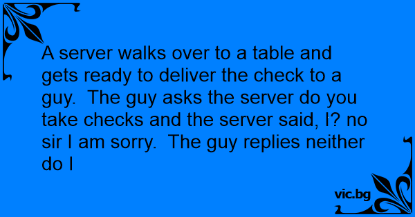 A server walks over to a table and gets ready to deliver the check to a guy. The guy asks the server do you take checks and the server said, I? no sir I am sorry. The guy replies neither do I