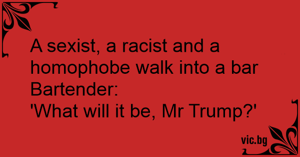 A sexist, a racist and a homophobe walk into a bar