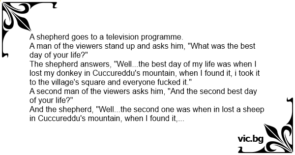 The shepherd answers, "Well...the best day of my life was when I lost my donkey in Cuccureddu's mountain, when I found it, i took it to the village's square and everyone fuскеd it."