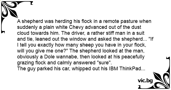 A shepherd was herding his flock in a remote pasture when suddenly a plain white Chevy advanced out of the dust cloud towards him. The driver, a rather stiff man in a suit and tie, leaned out the window and asked the shepherd... "If I tell you exactly how many sheep you have in your flock, will you give me one?" The shepherd looked at the man, obviously a Dole wannabe, then looked at his peacefully grazing flock and calmly answered "sure".