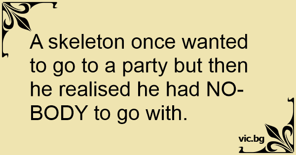 A skeleton once wanted to go to a party but then he realised he had NO-BODY to go with.