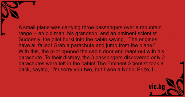 A small plane was carrying three passengers over a mountain range -- an old man, his grandson, and an eminent scientist. Suddenly, the pilot burst into the cabin saying, "The engines have all failed! Grab a parachute and jump from the plane!"