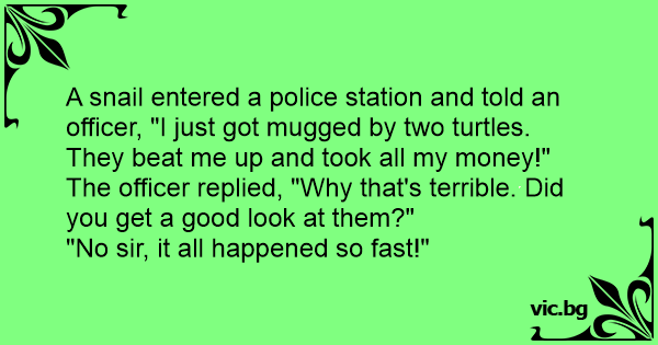 A snail entered a police station and told an officer, "I just got mugged by two turtles. They beat me up and took all my money!" The officer replied, "Why that's terrible. Did you get a good look at them?"