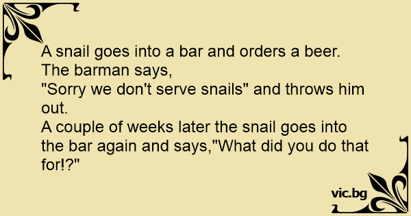 A couple of weeks later the snail goes into the bar again and says,"What did you do that for!?"