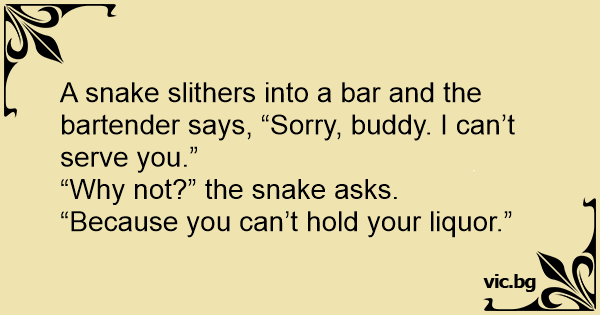 A snake slithers into a bar and the bartender says, “Sorry, buddy. I can’t serve you.”