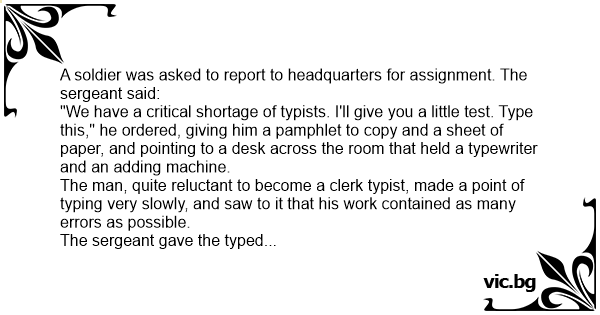 The sergeant grinned. "You passed the test," he replied, "when you sat down at the typewriter instead of at the adding machine."