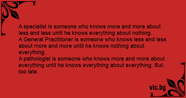 A pathologist is someone who knows more and more about everything until he knows everything about everything. But, too late.