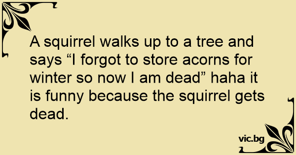 A squirrel walks up to a tree and says “I forgot to store acorns for winter so now I am dead” haha it is funny because the squirrel gets dead.