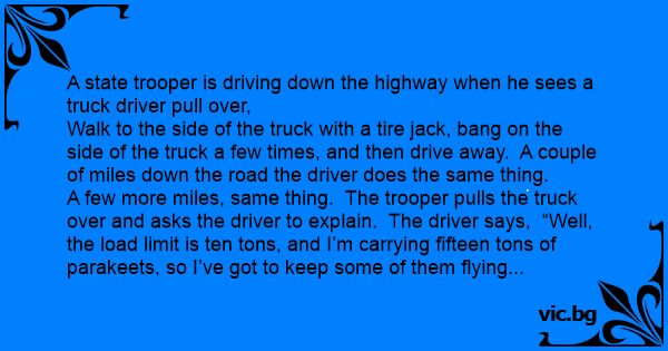 A few more miles, same thing. The trooper pulls the truck over and asks the driver to explain. The driver says, “Well, the load limit is ten tons, and I’m carrying fifteen tons of parakeets, so I’ve got to keep some of them flying around.”