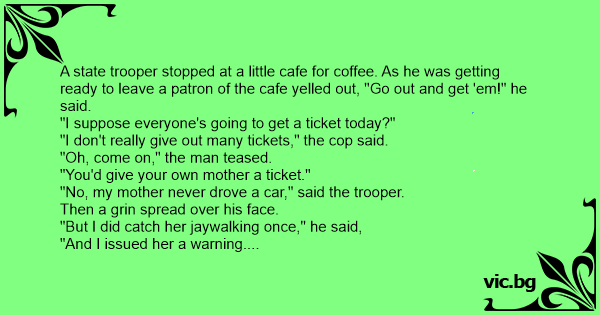 A state trooper stopped at a little cafe for coffee. As he was getting ready to leave a patron of the cafe yelled out, "Go out and get 'em!" he said.