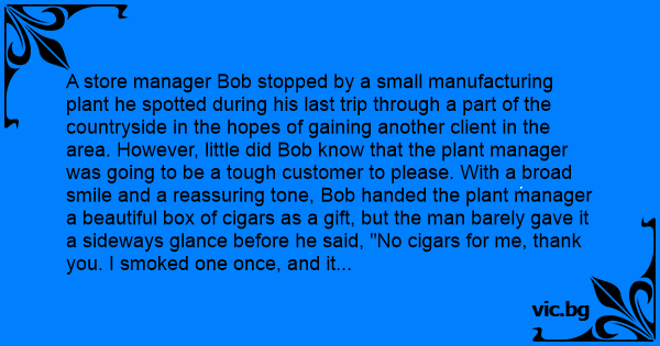 A store manager Bob stopped by a small manufacturing plant he spotted during his last trip through a part of the countryside in the hopes of gaining another client in the area. However, little did Bob know that the plant manager was going to be a tough customer to please. With a broad smile and a reassuring tone, Bob handed the plant manager a beautiful box of cigars as a gift, but the man barely gave it a sideways glance before he said, "No cigars for me, thank you. I smoked one once, and it was horrible." Bob is nothing if not prepared, so he offered to take the plant manager out for a few beers, but again the suggestion missed the mark. "No alcohol for me, thank you. I drank it once, and it was horrible." Not ready to give up just yet, Bob got a bright idea as he looked out the window and saw people playing golf. "That's quite alright," he told the plant manager. "How about you come and play a round of golf at my club as my personal guest?" However, for the third time, Bob's luck struck out, as the plant manager replied, "No golf for me, thank you. I played the sport once, and it was horrible." The plant manager had barely finished his sentence when a young man joined them at the table. "Let me introduce my son, Jason," the plant manager said. Surprised, Bob gave the young man a quick once over before he replied, "Let me guess, he is an only child?"