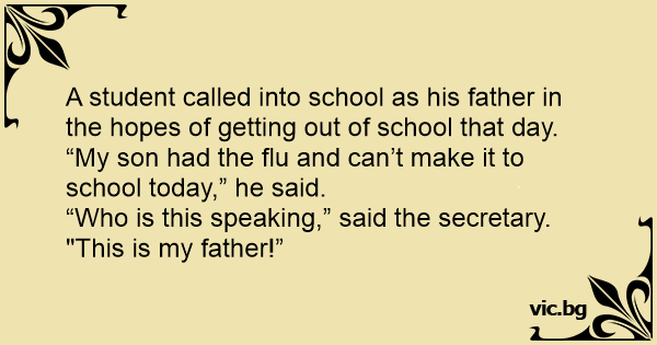 Pupil (on phone): My son has a bad cold and won't be able to come to school today. School Secretary: Who is this? Pupil: This is my father speaking!