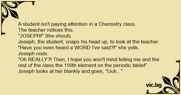 "Oh REALLY?! Then, I hope you won't mind telling me and the rest of the class the 116th element on the periodic table!"