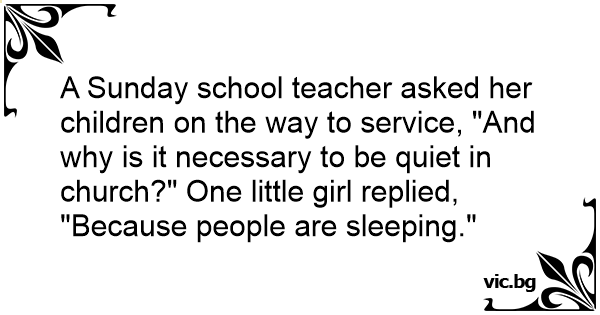 Sekmadieninės mokyklos mokytoja paklausė savo vaikų, beeinančių į bažnyčios susirinkimą: „Kodėl bažnyčioje būtina laikytis tylos?“ Viena guvi mergaitė atsakė: „Nes ten visi miega“.