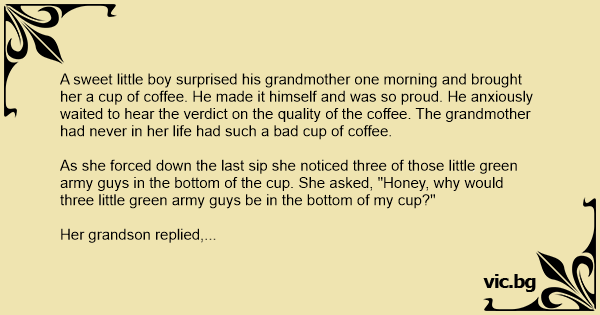 A sweet little boy surprised his grandmother one morning and brought her a cup of coffee. He made it himself and was so proud. He anxiously waited to hear the verdict on the quality of the coffee. The grandmother had never in her life had such a bad cup of coffee.