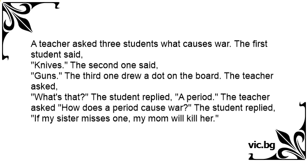 "What's that?" The student replied, "A period." The teacher asked "How does a period cause war?" The student replied, "If my sister misses one, my mom will кill her."