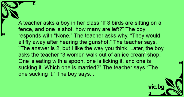 "The answer is 2, but I like the way you think. Later, the boy asks the teacher “3 women walk out of an ice cream shop. One is eating with a spoon, one is licking it, and one is suскing it. Which one is married?” The teacher says “The one suскing it.” The boy says “No, the one wearing the ring, but I like the way you think.”