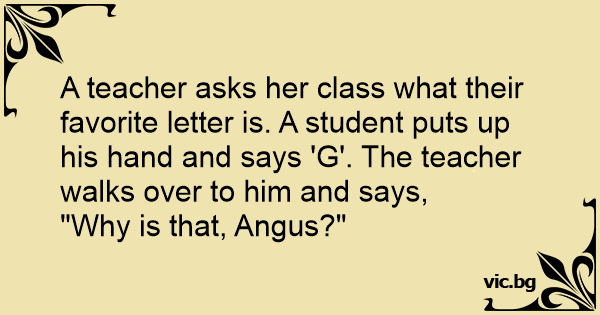 A teacher asks her class what their favorite letter is. A student puts up his hand and says 'G'. The teacher walks over to him and says,