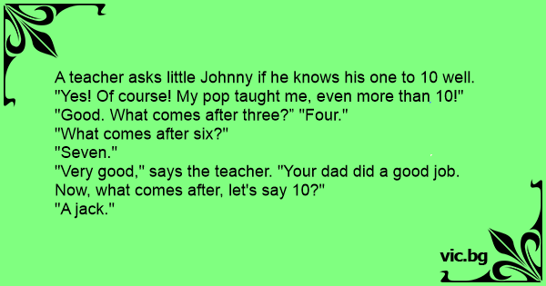 A teacher asks little Johnny if he knows his one to 10 well. "Yes! Of course! My pop taught me, even more than 10!"