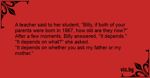 A teacher said to her student, "Billy, if both of your parents were born in 1967, how old are they now?"
