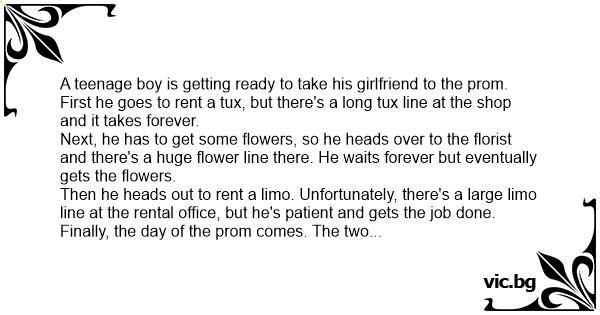 A teenage boy is getting ready to take his girlfriend to the prom. First he goes to rent a tux, but there's a long tux line at the shop and it takes forever.