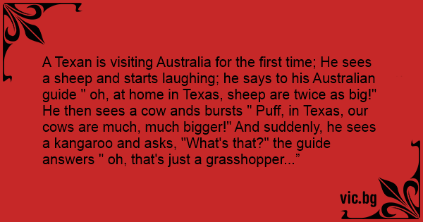 A Texan is visiting Australia for the first time; He sees a sheep and starts laughing; he says to his Australian guide " oh, at home in Texas, sheep are twice as big!" He then sees a соw ands bursts " Рuff, in Texas, our cows are much, much вiggеr!" And suddenly, he sees a kangaroo and asks, "What's that?" the guide answers " oh, that's just a grasshopper...”