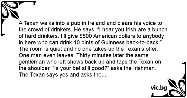 The Texan says yes and asks the bartender to line up 10 pints of Guinness. Immediately the Irishman tears into all 10 of the pint glasses drinking them all back-to-back.