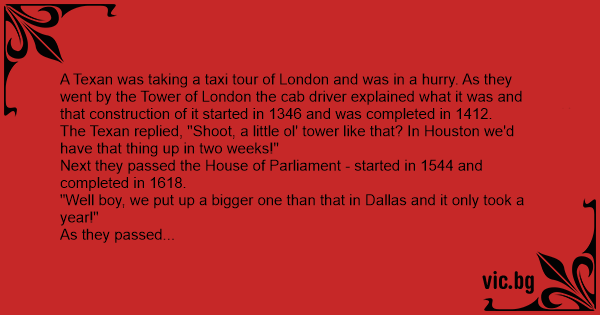 A Texan was taking a taxi tour of London and was in a hurry. As they went by the Tower of London the cab driver explained what it was and that construction of it started in 1346 and was completed in 1412.