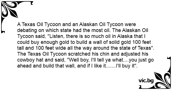 A Texas Oil Tycoon and an Alaskan Oil Tycoon were debating on which state had the most oil. The Alaskan Oil Tycoon said, "Listen, there is so much oil in Alaska that I could buy enough gold to build a wall of solid gold 100 feet tall and 100 feet wide all the way around the state of Texas". The Texas Oil Tycoon scratched his сhin and adjusted his cowboy hat and said, "Well boy, I'll tell ya what....you just go ahead and build that wall, and if I like it.......I'll buy it".