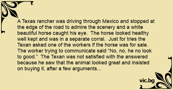 A Texas rancher was driving through Mexico and stopped at the edge of the road to admire the scenery and a white beautiful horse caught his eye. The horse looked healthy well kept and was in a separate corral. Just for tries the Texan asked one of the workers if the horse was for sale. The worker trying to communicate said “No, no, he no look to good.” The Texan was not satisfied with the answered because he saw that the animal looked great and insisted on buying it, after a few arguments the worker arranged for the sale and the Texan took the horse back to his ranch. He rode the horse through his ranch and galloped to the barn when suddenly the horse ran right into the barn wall. Frustrated the Texan takes the horse back to Mexico and talks to the worker that sold him the horse and explains what happened. The worker said, “I told you he no look to good”