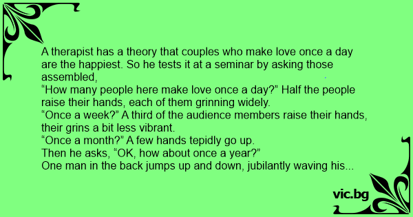 A therapist has a theory that couples who make love once a day are the happiest. So he tests it at a seminar by asking those assembled,