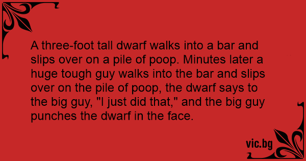 A three-foot tall dwarf walks into a bar and slips over on a pile of роор. Minutes later a huge tough guy walks into the bar and slips over on the pile of роор, the dwarf says to the big guy, "I just did that," and the big guy punches the dwarf in the face.