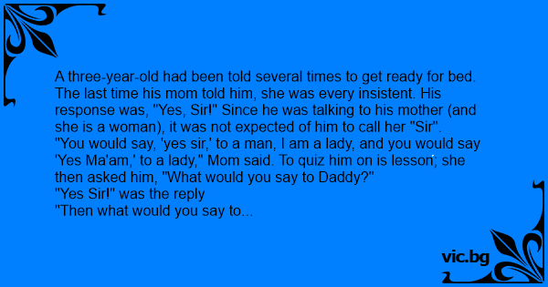 A three-year-old had been told several times to get ready for bed. The last time his mom told him, she was every insistent. His response was, "Yes, Sir!" Since he was talking to his mother (and she is a woman), it was not expected of him to call her "Sir".