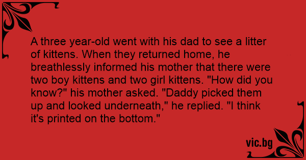 A three year-old went with his dad to see a litter of kittens. When they returned home, he breathlessly informed his mother that there were two boy kittens and two girl kittens. "How did you know?" his mother asked. "Daddy picked them up and looked underneath," he replied. "I think it's printed on the bottom."